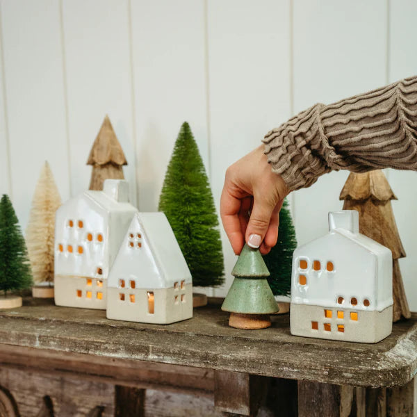 Handmade with sandy clay bases and white glaze dip, the natural-hued Ceramic Tealight Houses come alive with the light of a flickering candle. We love to display them in a village grouping on mantels and consoles paired with decorative trees.